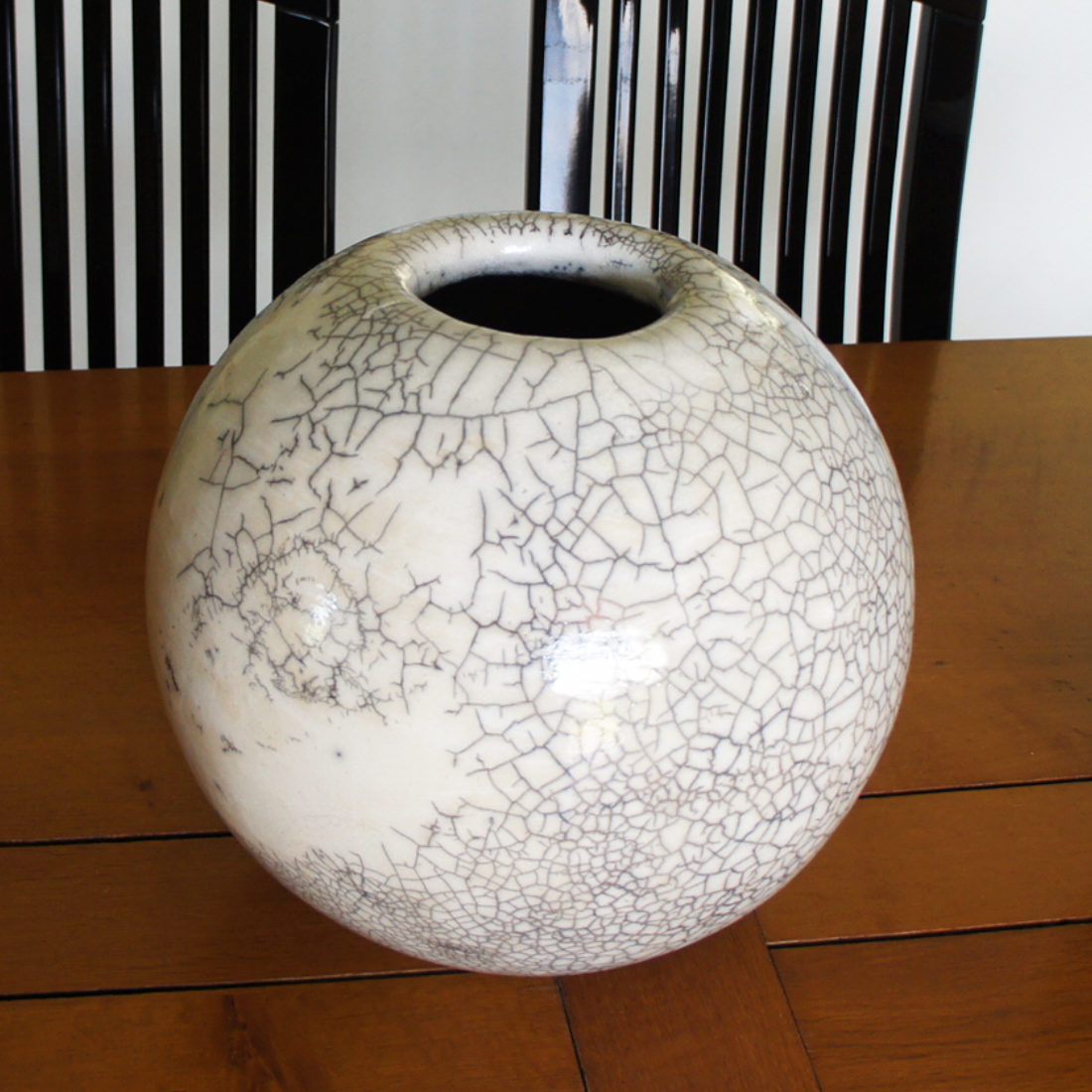 Die Tonvase in Kugelform ist ein wunderschönes Unikat und einzigartiges Dekostück für jeden Raum. Sie wurde handgeformt und in der Raku-Technik gefertigt, was zu den charakteristischen Rissen in der glänzend weissen Oberfläche führt. Die Vase verfügt über einen Glaseinsatz für Blumen und Trockenblumen, der sich leicht entfernen und reinigen lässt. Sie kann in verschiedenen Räumen wie Wohnzimmer, Schlafzimmer oder Arbeitszimmer aufgestellt werden und verleiht jedem Raum eine stilvolle Note.