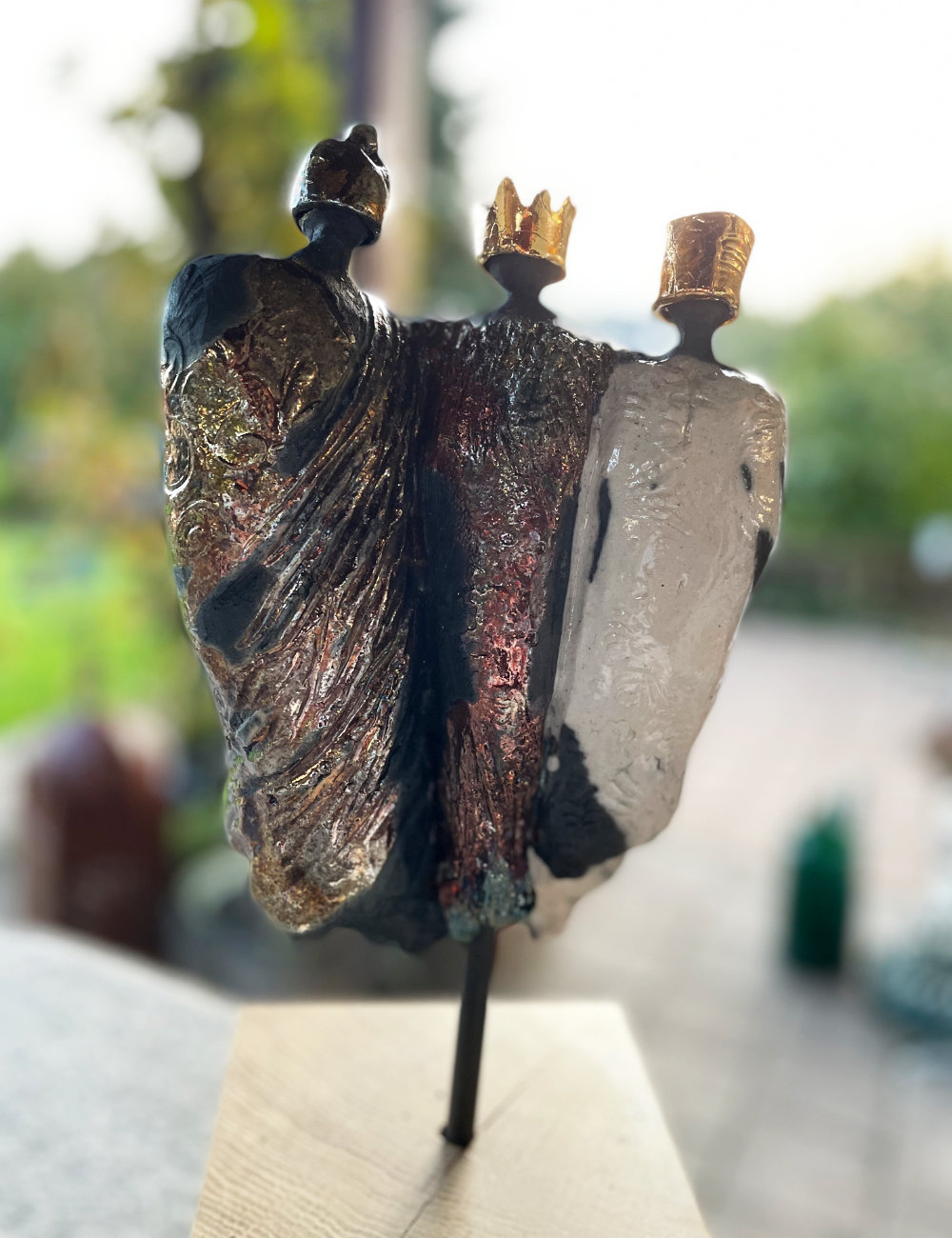 Die beeindruckende Tonkreation mit dem Titel ‚Drei Könige‘ ist ein wunderschönes Kunstobjekt, das auf einem eleganten Holzsockel präsentiert wird. Die Tonfiguren repräsentieren drei Könige und sind in einem tiefen Schwarz gehalten. Jeder König trägt einen prächtigen Mantel in den Farben Weiss, Gold und Rot, die dem Werk einen königlichen und lebendigen Charakter verleihen. Die Figuren sind anmutig gestaltet und tragen majestätische goldene Kronen auf ihren Häuptern. Die Drei Könige sind einzigartig und wurden in der Raku-Technik gefertigt, was charakteristische Risse und Texturen auf der Oberfläche erzeugt. Dieses Kunstobjekt ist ein absolutes Unikat und ein faszinierender Blickfang für jeden Raum. Es vereint handwerkliches Können mit künstlerischer Ausdrucksstärke und wird zweifellos Bewunderung und Staunen hervorrufen.