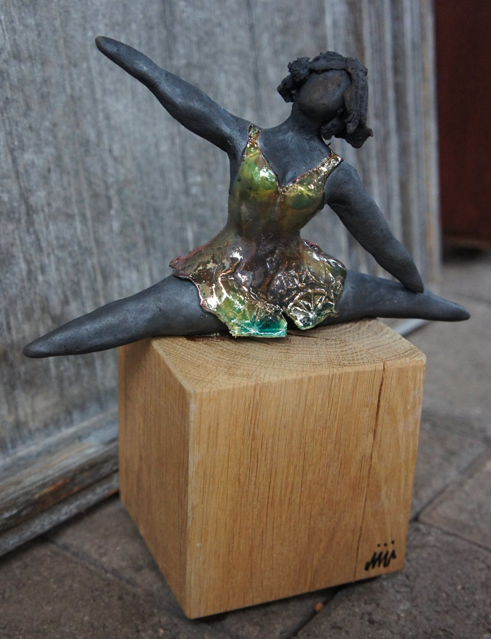 Die faszinierende Tonkreation mit dem Titel ‚Frau macht Spagat‘ ist ein beeindruckendes Kunstobjekt, das auf einem stilvollen Holzsockel präsentiert wird. Die schwarze Tonfigur zeigt eine Frau in einer atemberaubenden Spagatposition. Sie verkörpert Stärke, Flexibilität und Grazie. Die Frau ist in ein wunderschönes türkisfarbenes Kleid gehüllt, das mit goldenen Akzenten verziert ist. Diese Farbkombination verleiht der Figur einen eleganten und edlen Touch. Die Tonfigur wurde von Hand geformt und in der Raku-Technik gefertigt, wodurch charakteristische Risse und Texturen entstehen, die dem Kunstwerk eine einzigartige Ausstrahlung verleihen. Dieses Kunstobjekt ist ein absolutes Unikat und ein Blickfang in jedem Raum. Es symbolisiert Anmut, Kraft und die Schönheit des menschlichen Körpers. Es ist ein fesselndes Kunstwerk, das Bewunderung und Inspiration hervorruft.