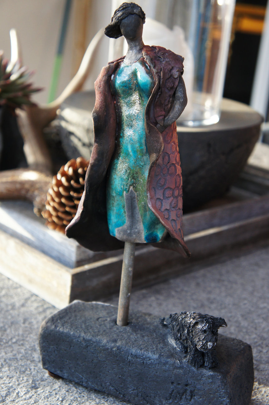 Die Tonfigur ‚Frau mit Hund‘ ist ein einzigarties Kunstwerk, das in der Raku-Technik gefertigt wurde. Die Figur stellt eine Frau dar, die ein türkises Kleid mit Mantel trägt und einen Hund begleitet. Der Mantel der Frau ist mit Eisenchlorid behandelt, was ihm eine rustikale und natürliche Optik verleiht. Die Behandlung mit Eisenchlorid sorgt für eine spezielle Verfärbung und Textur des Tonmaterials. Der Sockel, auf dem die Tonfigur steht, ist wie die Figur aus Ton gefertigt. Die Tonkreation eignet sich besonders als dekoratives Element im Wohnzimmer oder auch als Geschenk für Kunstliebhaber und Hundeliebhaber.