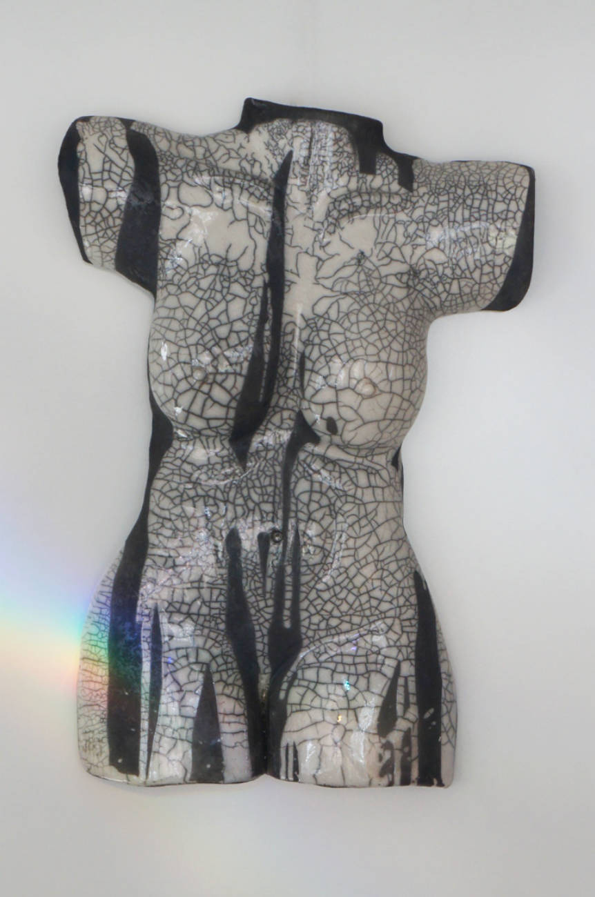 Die Tonfigur Frauentorso ist ein handgeformtes Kunstwerk, das in der Raku-Technik gefertigt wurde. Die Farbe Schwarz bildet einen schönen Kontrast zur glänzenden weissen Glasur, die charakteristische Risse der Raku-Technik aufweist. Die Figur ist zum Aufhängen als Wanddekoration gedacht und bringt mit ihrem einzigartigen Design und ihrer künstlerischen Ausstrahlung eine besondere Atmosphäre in jeden Raum. Dieses Unikat ist ein Must-have für alle Kunstliebhaber und eine aussergewöhnliche Ergänzung für jede Wanddekoration.