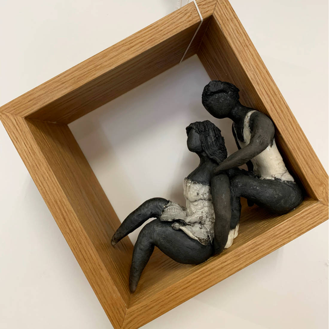 Diese Tonkreation zeigt ein romantisches Liebespaar und wird in einem schönen Holzrahmen präsentiert. Die Figuren sind aus Ton gefertigt und in der Raku-Technik verarbeitet, was zu charakteristischen Rissen auf der Oberfläche führt. Die Körper der Tonfiguren sind schwarz und mit weisser Kleidung aus Glasur überzogen. Das Kunstwerk ist einzigartig und eignet sich perfekt als Wanddekoration für jeden Raum.