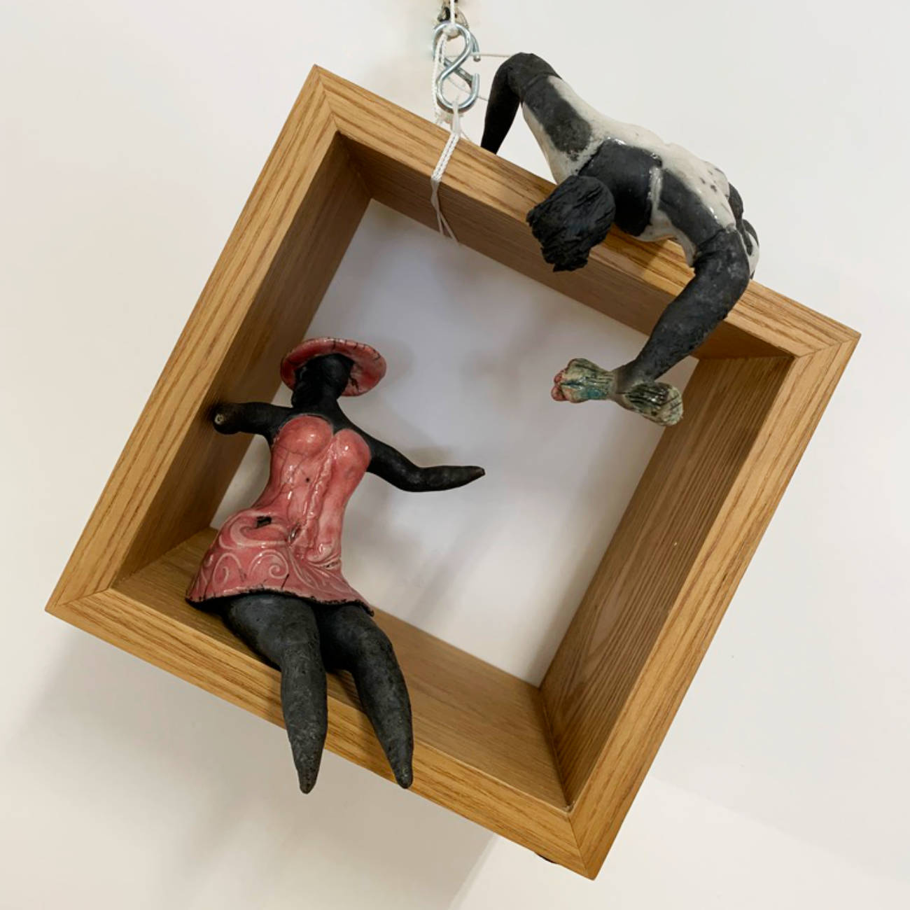 Die Tonkreation zeigt ein Liebespaar in einem Holzrahmen und ist in der Raku-Technik gefertigt. Die schwarzen Figuren tragen Kleidung in Weiss und Pink, die aus Glasur besteht. Die charakteristischen Risse der Raku-Technik sind auf der Oberfläche der Tonfiguren zu sehen und verleihen ihr einzigartige Details. Das Kunstwerk ist ein Unikat und kann als Wanddekoration aufgehängt werden. Es ist ein wunderschönes Stück für jedes Zuhause und ein perfektes Geschenk für jeden, der Romantik und Kunst liebt.