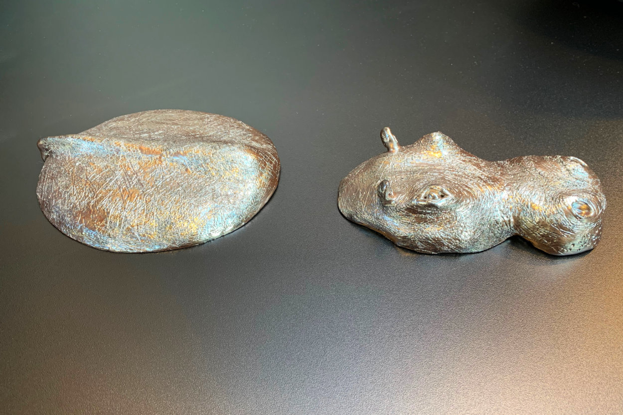 Das Nilpferd ist eine einzigartige Tonkreation. Die Figur besteht aus zwei Teilen – dem Kopf und dem Rücken des Nilpferds – und ist in einem auffälligen Silberton gehalten. Das Silber verleiht der Figur einen besonderen Glanz und unterstreicht ihre natürliche Form. Die Tonfigur ist handgemacht und mit der Elektrobrand-Technik gefertigt. Die Herstellung mit Elektrobrand ist eine moderne Keramiktechnik, bei der das Tonobjekt in einem Ofen unter hohen Temperaturen gebrannt wird. Dies verleiht dem Ton eine hohe Festigkeit und Haltbarkeit. Die Tonfigur „Nilpferd“ verleiht jedem Wohnraum eine exotische Note und kann auch als Geschenk für Tierliebhaber oder für Sammler von Kunstwerken aus Ton dienen.