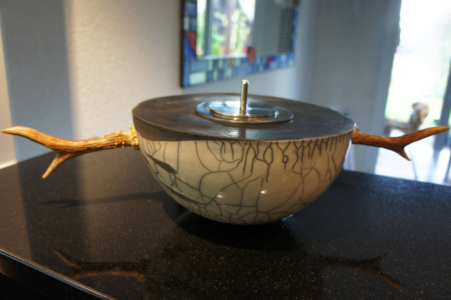 Der Feuertopf ist eine wunderschöne Tonkreation in Halbkugelform, die mit einem Bioethanoleinsatz ausgestattet ist. Der Bioethanoleinsatz kann einfach mit Bioethanol gefüllt werden, um ein wärmendes Feuer zu erzeugen. Handgefertigt in der Raku-Technik, ist jeder Feuertopf ein einzigartiges Unikat mit charakteristischen Rissen und individuellem Aussehen. Die Farben des Feuertopfes sind Schwarz und Weiss, die in einem einzigartigen Muster aufeinander treffen und eine beeindruckende Ästhetik schaffen. Die Halbkugel ist links und rechts mit Hirschhörnern verziert, die dem Feuertopf eine rustikale Note verleihen.