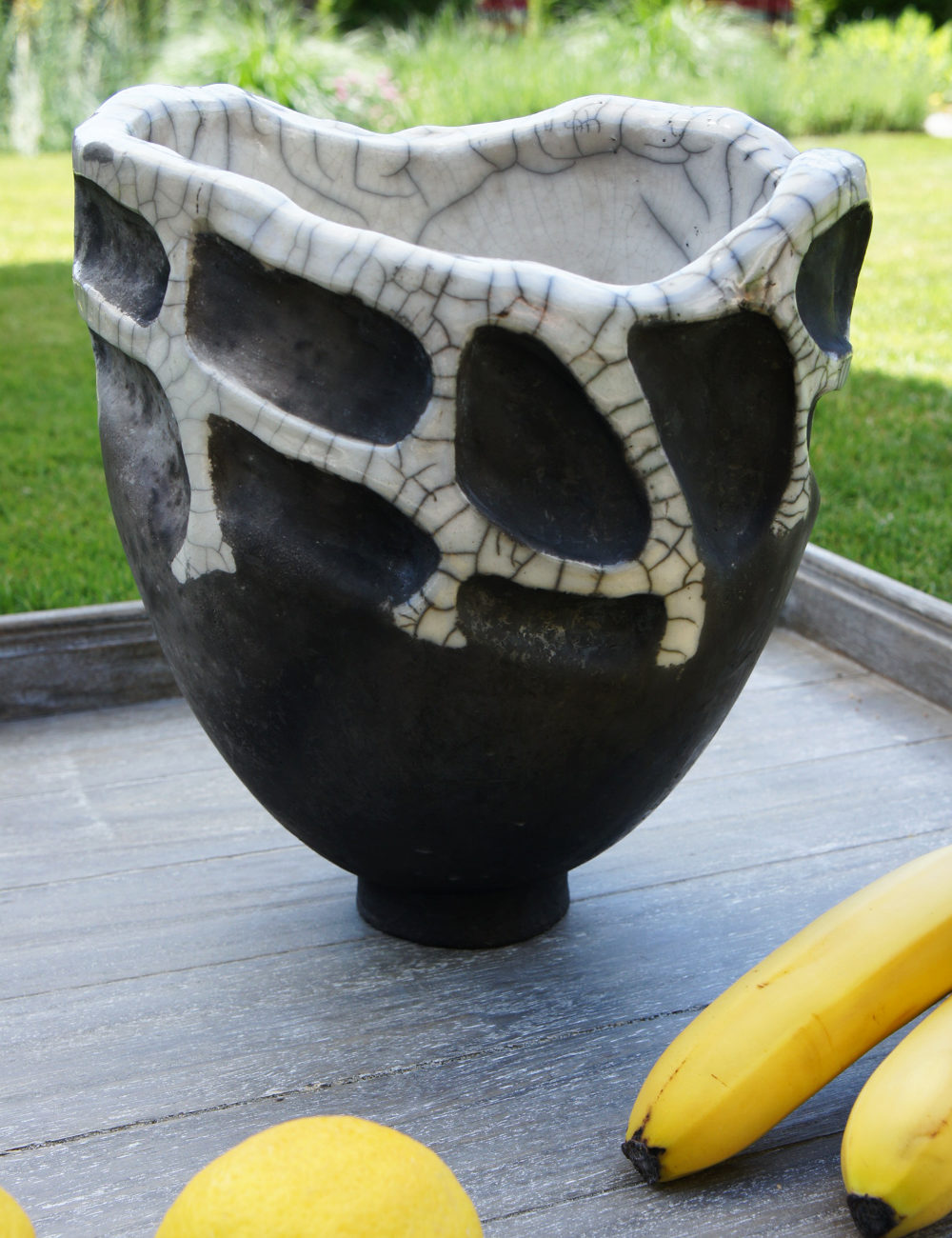 Der Morcheltopf ist ein einzigartiges Unikat aus Ton, das in der Raku-Technik handgeformt und gefertigt wurde. Das Innere des Topfes ist in einem strahlenden Weiss gestaltet und weist charakteristische Risse auf, die typisch für die Raku-Technik sind. Aussen ist der Topf in Schwarz gehalten und mit weissen Elementen verziert, die die charakteristische Struktur des Morchelpilzes nachahmen.